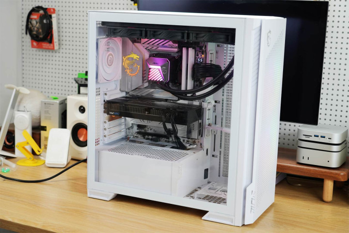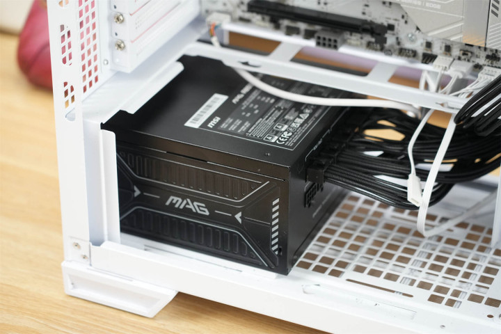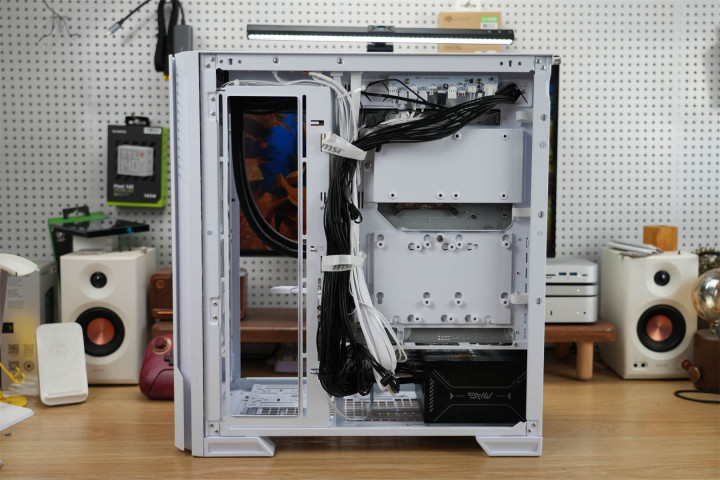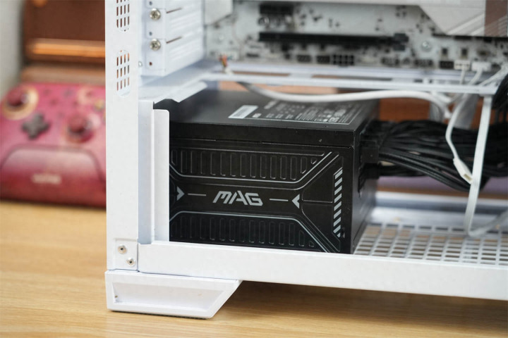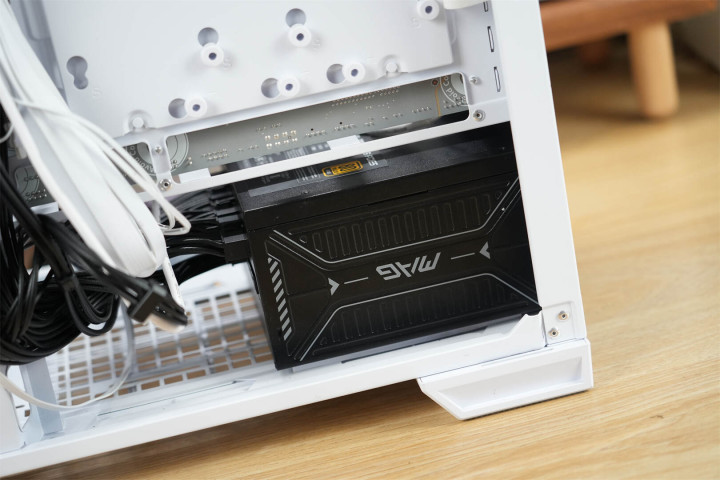 电源体积小巧的好处就是可以更好的适应更多的机箱,比如这款微星MPG VELOX 300R AIRFLOW PZ刀锋300机箱,其电源仓空间就很大,不过使用微星MAG A850GLS PCIE5电源也就占用了一半的空间。