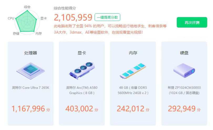 整体跑分:2105959分,其中显卡为403002分,处理器1167995分。