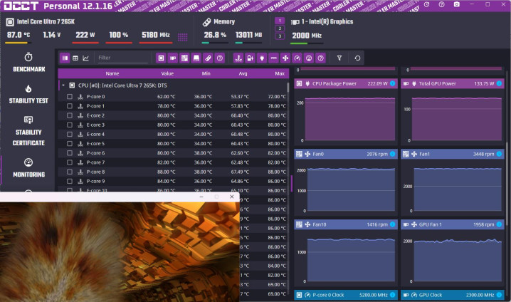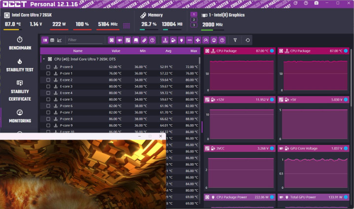 还是双烤,通过OCCT观察电源输出以及硬件的功耗。CPU功耗为222W,GPU功耗达到133W,此时,电源的12V输出电压始终保持在11.952V,而5V的输出电压为5.03V平稳如直线,可以说微星MAG A850GLS PCIE5的电压输出稳定性极为出色。