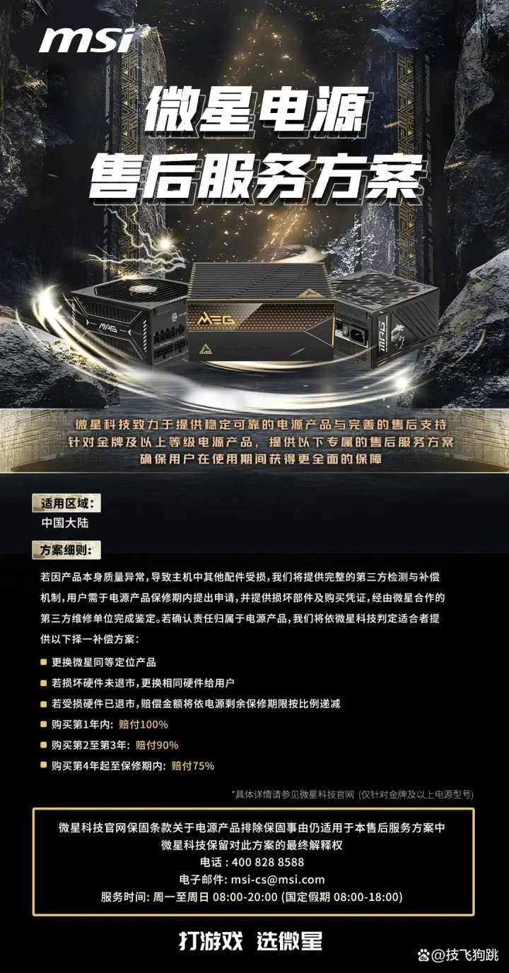 再来说说微星最新升级的保修政策,针对中国大陆市场所售卖的金牌及以上等级电源产品,推出全新升级的售后服务方案。此次升级以“用户权益优先”为核心理念,在行业内首创“电源质量问题致硬件连带受损全额赔付”机制,充分彰显了微星对高端电源品质的坚定担当与高度自信。