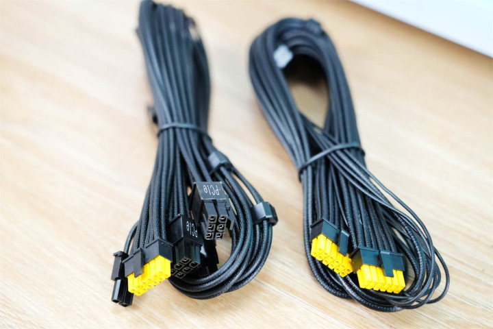 配件中包含 11 根线材以及一套固定螺丝。在这些压纹模组线里,有 2 根是 PCIE 供电线,每根线带有 1 个 6 + 2 接头用于输出;还有 2 根 CPU 供电线,每根线配备 1 个 4 + 4 接头用于输出;另外有 1 根是主板电源 24PIN 输出供电线。配件总共提供了 8 个 SATA 接头、3 个 MOLEX 接头(也就是大 4PIN 接头)以及 1 个 FDD 软驱接头。此外,有 1 根 PCI - E 5.1 线,它提供 12V - 2x6 接头;还有 1 根 PCI - E 5.1 线,这根线接到电源的一头是 12V - 2x6 接头,而接到电脑的那头则是 2 个 6 + 2PIN 显卡接头。简单说设计升级了,新老显卡通吃。