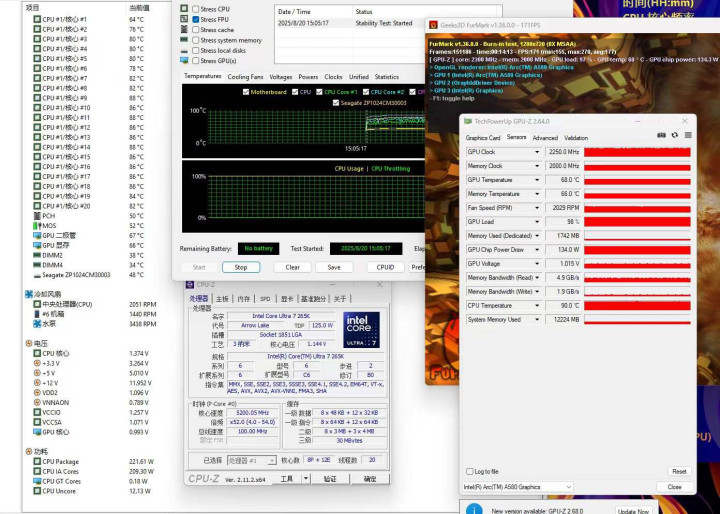 接下来对微星MAG A850GLS PCIE5电源展开测试,考察其在当前配置极限功耗运行时的动力输出稳定情况。测试运用AIDA64 FPU搭配甜甜圈进行双烤,10分钟双烤测试,其中CPU功耗达221W,GPU显卡功耗为134W,对于一款额定功率850W的电源来说绰绰有余。